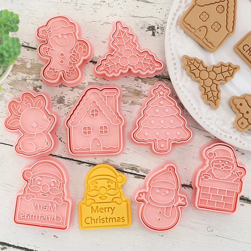 A festive 3D cookie cutter set designed to create detailed Christmas-themed treats. Featuring press-and-stamp functionality, these molds shape and imprint designs in one step, making holiday baking easier and more decorative.