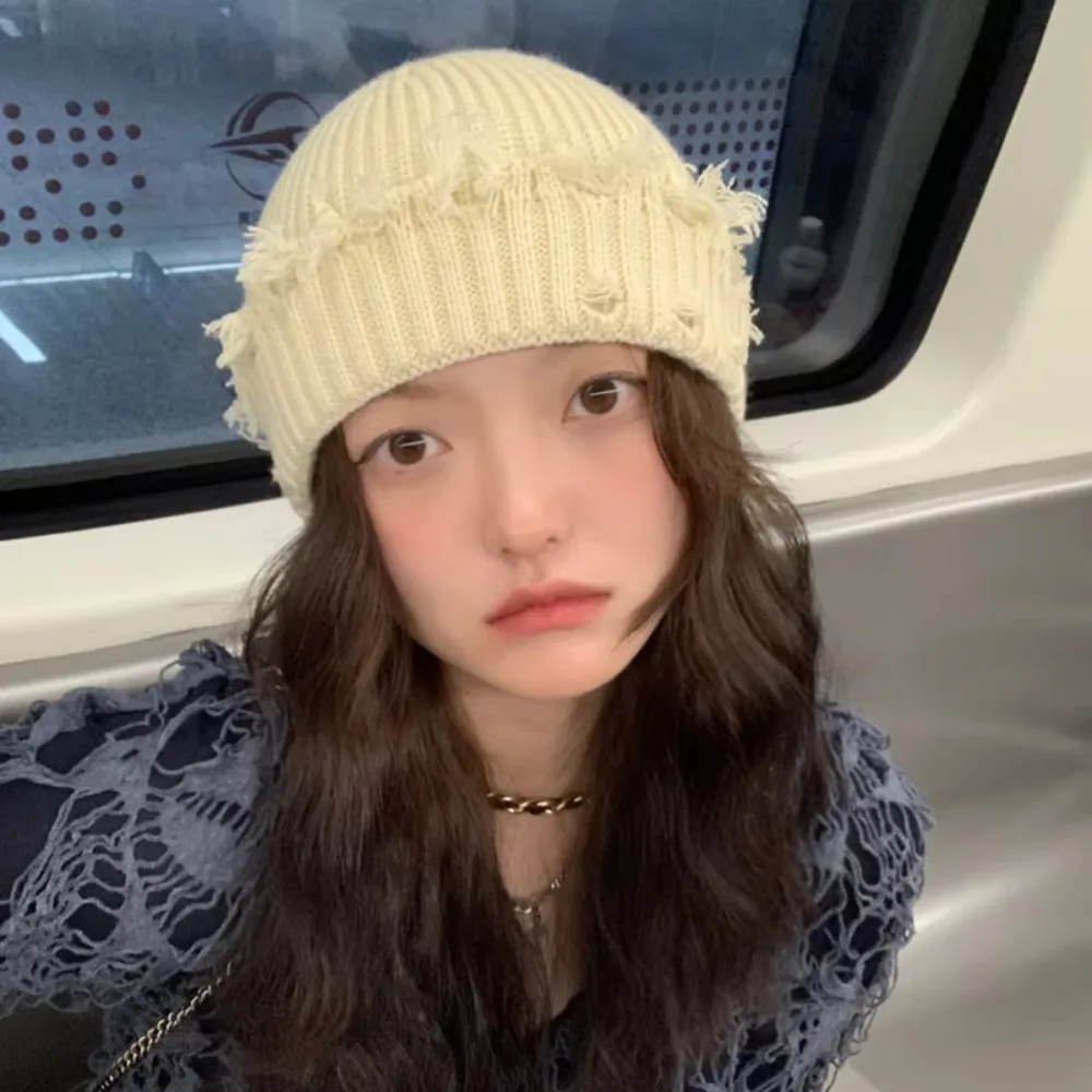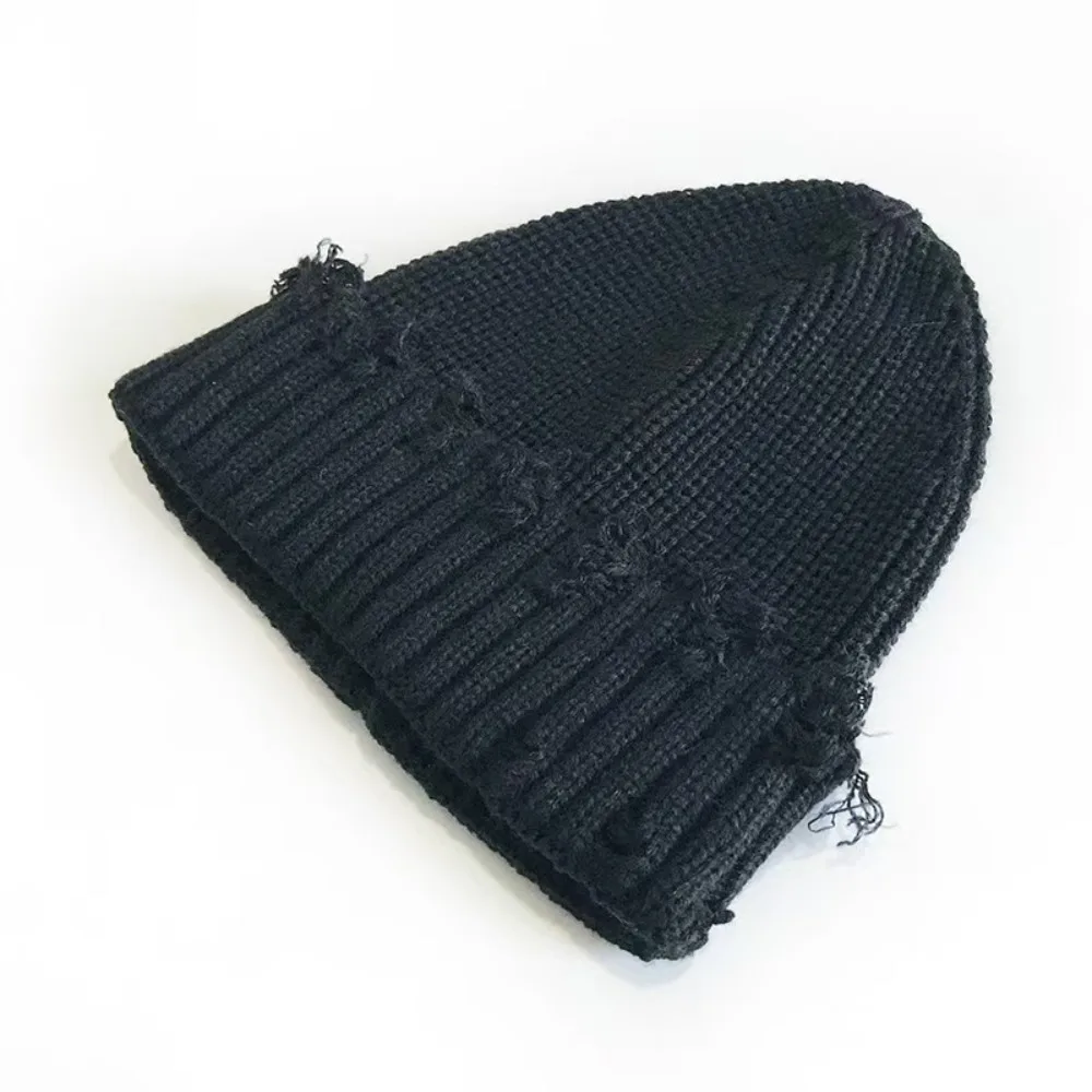 A trend-inspired knitted beanie featuring a distressed broken brim design. Built with thickened fabric for added warmth, it combines streetwear styling with winter functionality.