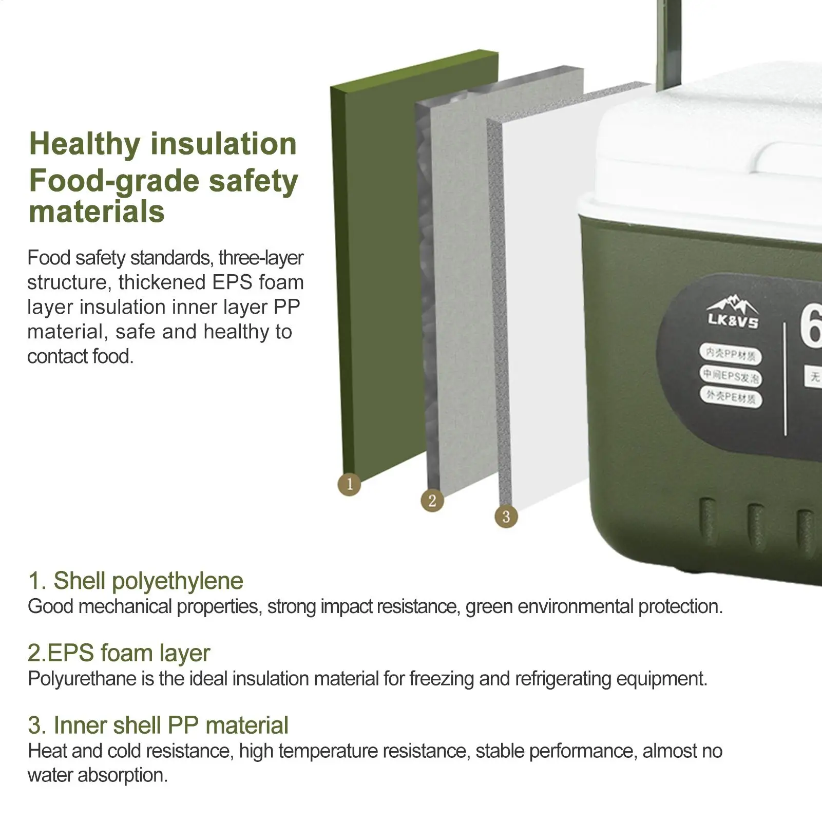 1.Three Layers: The 5.4 QT Compact Ice Coolers contain polyethylene outer shell, thickened EP S foam layer insulation, and PP inner layer, which is very healthy to use.