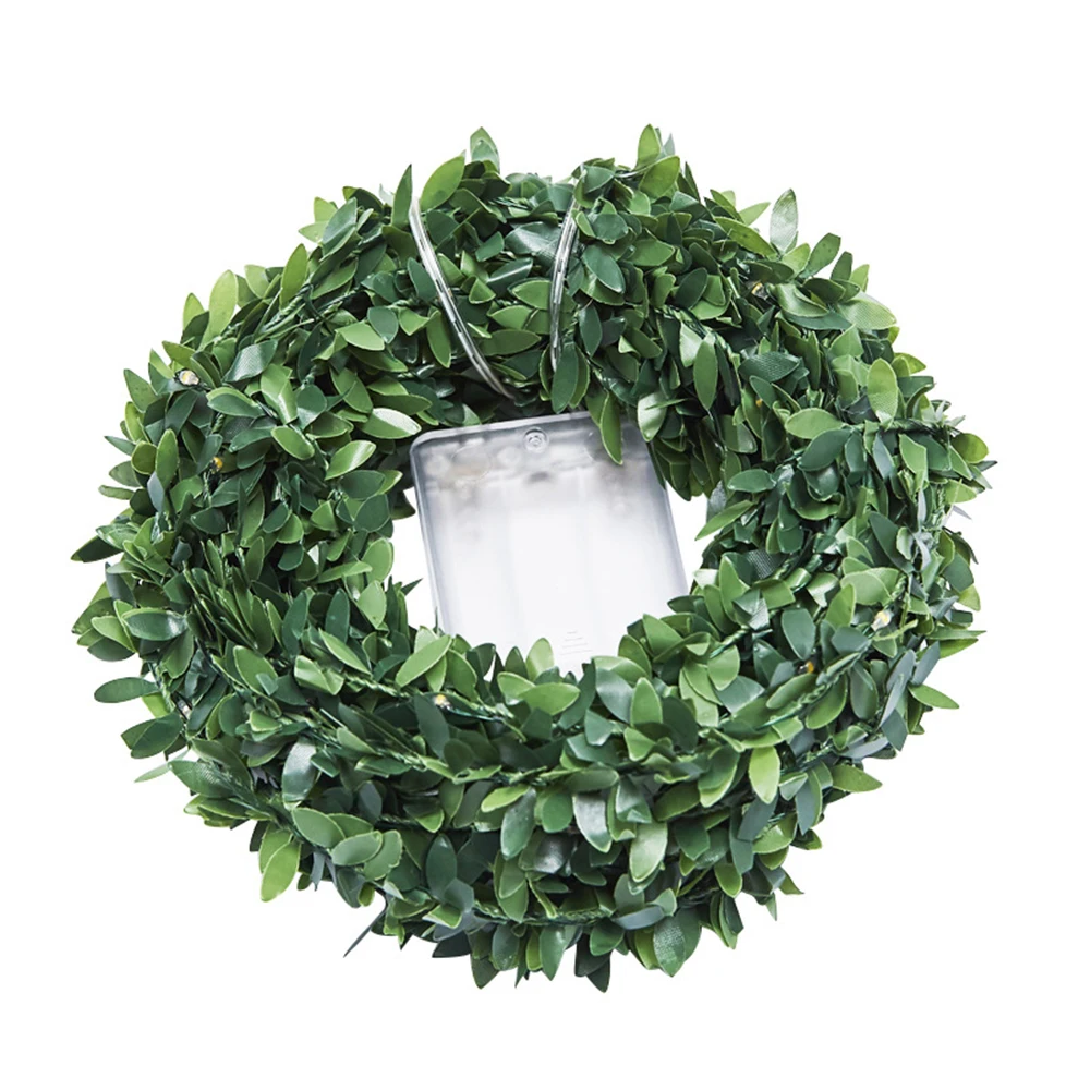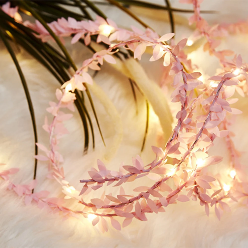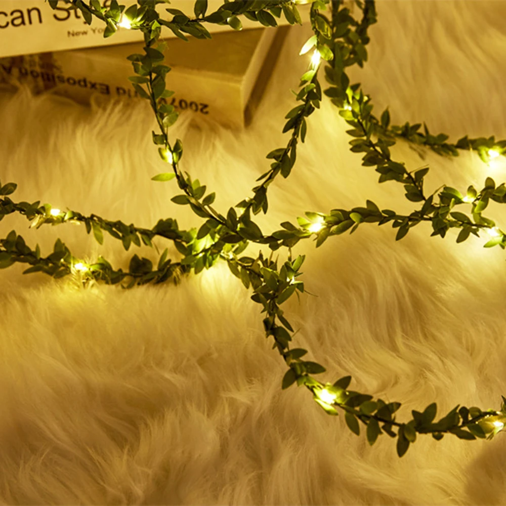 Flexible copper wire fairy lights combined with artificial green leaves for decorative displays. Designed for indoor use, these lights add a soft glow to weddings, tables, and festive arrangements.