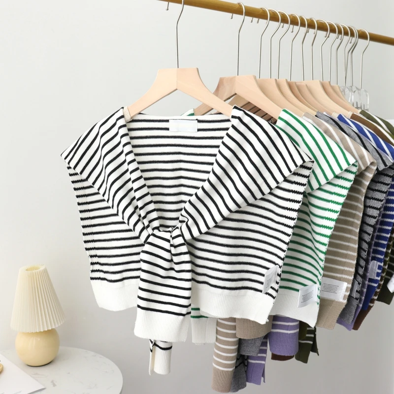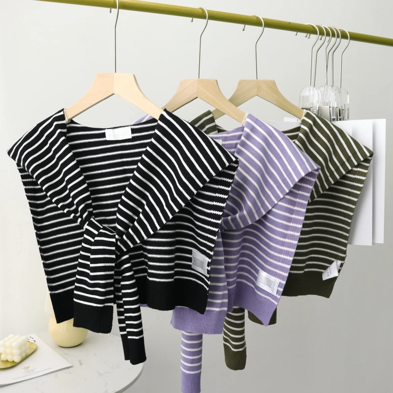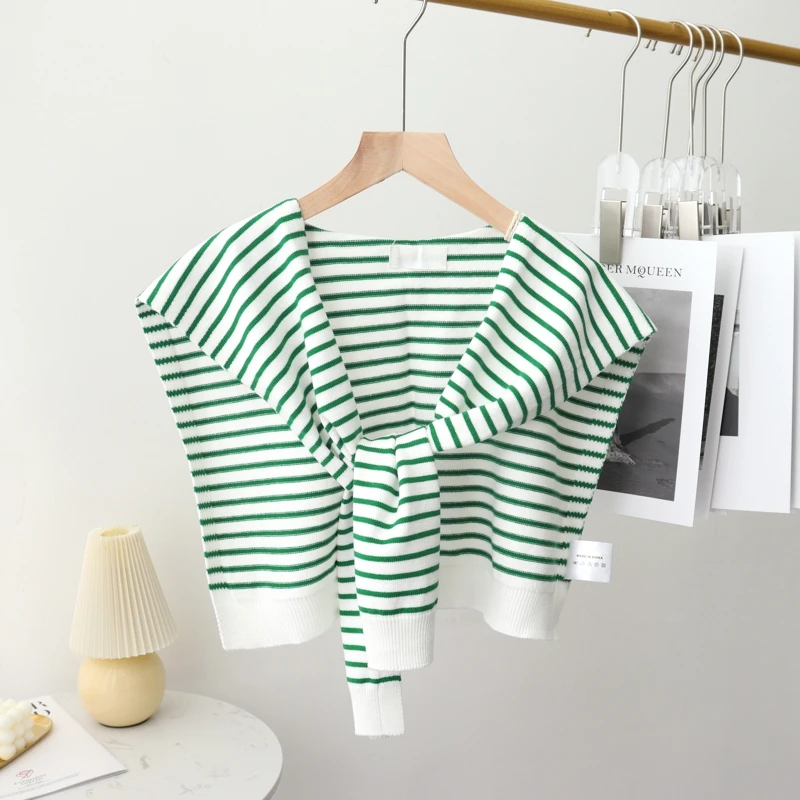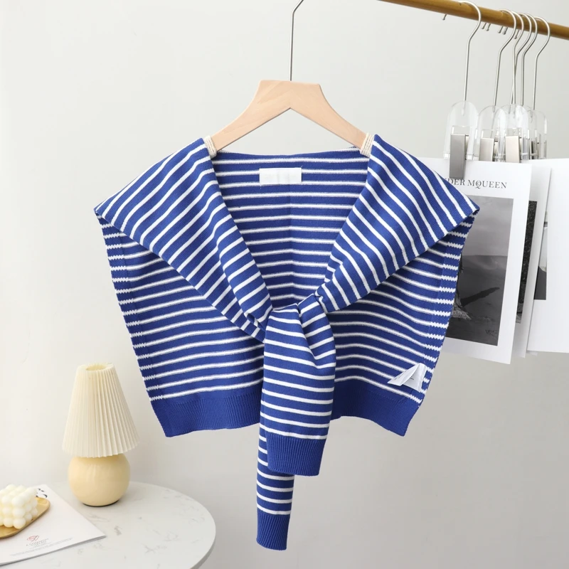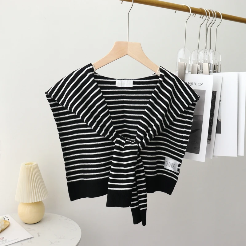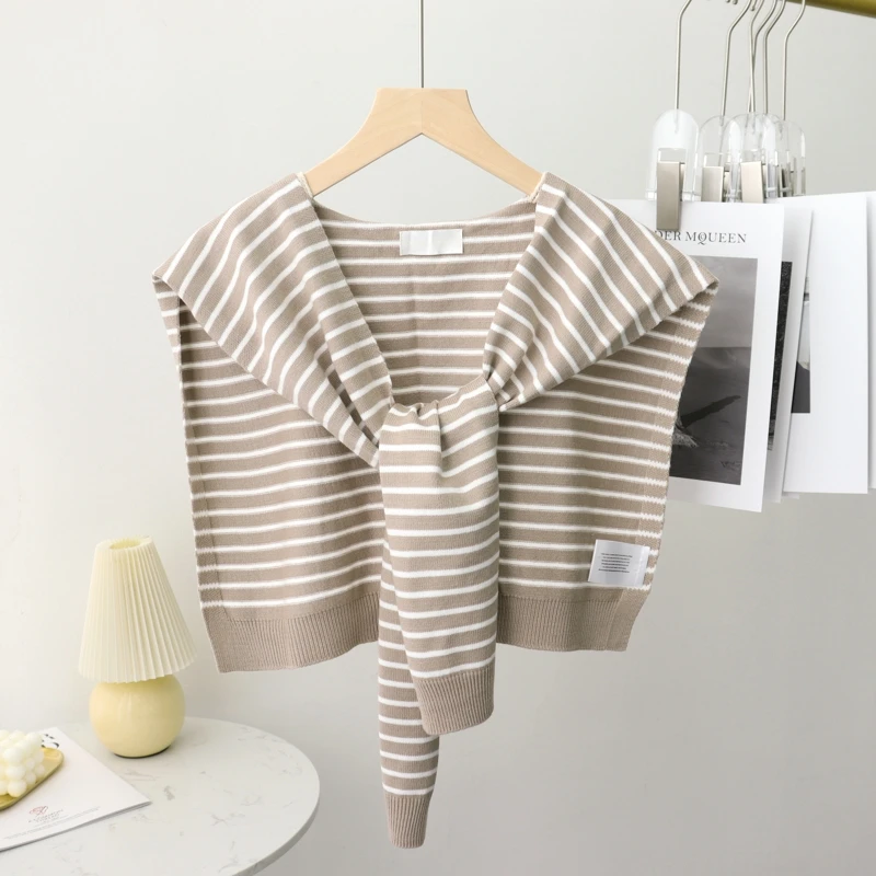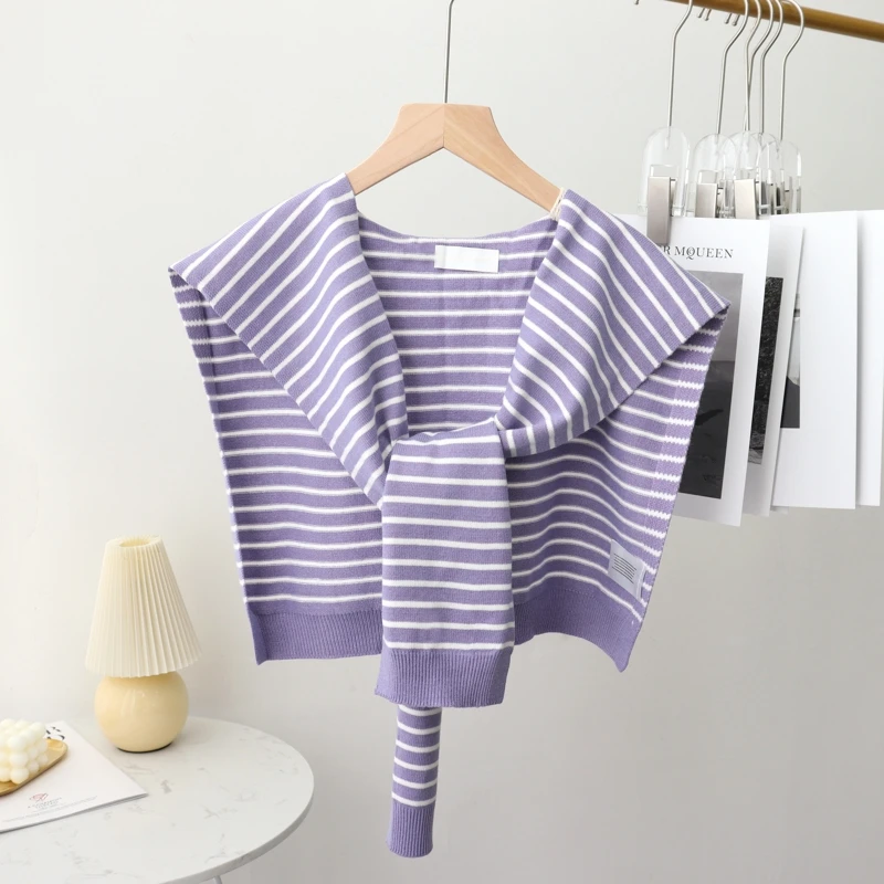 A fashionable knit shawl scarf designed to drape over the shoulders like a decorative collar. Crafted from blended fibers, it adds layered texture and warmth to blouses and coats during cooler seasons.